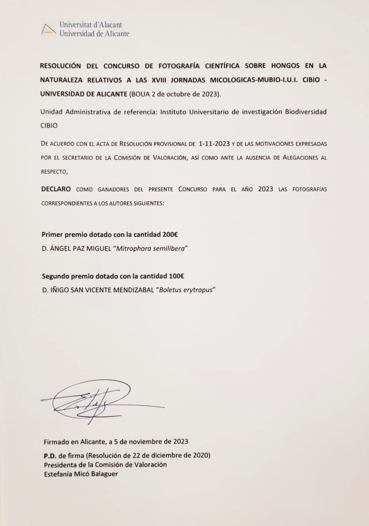 RESOLUCIÓN DEL CONCURSO DE FOTOGRAFÍA CIENTÍFICA SOBRE HONGOS EN LA NATURALEZA RELATIVOS A LAS XVIII JORNADAS MICOLÓGICAS-MUBIO-I.U.I CIBIO – UA – 2023